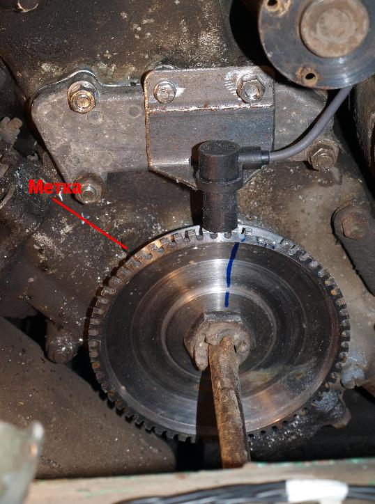 Если посчитать кол-во зубьев от датчика до метки на двигателе то их получается примерно 15, но установить метку напротив штырька на двигателе удалось только установоив опытным путем в менеджере значенме 21 с коррекцией в 2 градуса. Фото прилагаю может я что-то не так насчитал.